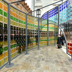 Composée de quelque 800 carreaux de verre disposés dans une extraordinaire composition chromatique, cette installation témoigne de la capacité unique de VENINI à proposer une si vaste gamme de couleurs : du vert au taupe, en passant par l'ambre et le jaune paille ; du rouge au saphir en passant par les tons rose, bordeaux et aigue-marine. Ces éléments sont réunis grâce à une ossature métallique autoportante, réalisée avec la contribution de DITH (Duferco International Trading Holding) et du groupe Jotun, ainsi que des artisans qualifiés de Carpenteria Sartori ; la structure simule une section d'adn et incitera les visiteurs à en faire pleinement l'expérience, en explorant ses couloirs kaléidoscopiques et ses chemins sinueux.